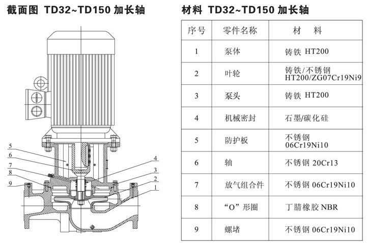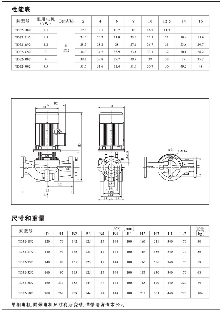 產(chǎn)品介紹 概述 TD32-18/2-1.1KW 鍋爐混流泵,配有標(biāo)準(zhǔn)電機(jī)和機(jī)械密封。此類產(chǎn)品的結(jié)構(gòu)與相近類型產(chǎn)品相比,更不易受到泵送液體中雜質(zhì)的影響。 產(chǎn)品設(shè)計為頂部可拉出的拆裝形式,其可以在不影響管路系統(tǒng)的情況下對泵進(jìn)行維護(hù)。 應(yīng)用 產(chǎn)品適宜在清潔、稀薄、非侵蝕、非易爆易燃,且不含有任何可能對泵造成機(jī)械或化學(xué)損害的固體顆粒和纖維的液體中使用。具體對液體要求及應(yīng)用如下;而在液體粘稠或密度較大情況下使用時會造成泵特性曲線的下降和能耗的增加。 液體溫度:-15℃~110℃ 系統(tǒng)最高壓力:常規(guī)型為PN12巴;特殊型為PN16巴。 TD產(chǎn)品在用于輸送水時,其可以用于生活用水、工業(yè)用水、冷卻系統(tǒng)用水和區(qū)域供熱系統(tǒng)的冷、熱用水。TD產(chǎn)品可以在以下位置使用: 1) 主循環(huán)泵 2) 混合環(huán)路中的泵 3) 鍋爐混流泵 4) 燃?xì)饫鋬鰴C(jī)泵 5) 部分流量過濾器泵 6) 定壓系統(tǒng)用泵 7) 生活熱水循環(huán) TD產(chǎn)品用于工業(yè)方面。如在化工、制藥、食品加工等行業(yè)。可以用于: 1) 原料的輸送 2) 系統(tǒng)增壓 3) 混合環(huán)路循環(huán)泵 安裝條件 產(chǎn)品有不同的安裝要求,具體的安裝要求如下: 1) 系統(tǒng)管路具有支撐泵的能力,2.2kw以下(包括2.2kw)電機(jī)的泵可以直接懸置于管道中 ;系統(tǒng)管路不具有支撐泵的能力或泵電機(jī)功率大于2.2kw時,泵必須安裝在支架或底板上。 2) 對于配套2.2kw以下(包括2.2kw)電機(jī)的泵可以安裝在水平或垂直于管道的位置上;對于2.2kw以上電機(jī)的泵只能安裝在垂直于管道的位置上。 3) 泵的安裝,要保證泵在使用時系統(tǒng)管路的張力不應(yīng)傳遞到泵體上。 4) 為了保證電機(jī)的正常運(yùn)轉(zhuǎn),泵要安裝在保證有足夠冷卻的環(huán)境條件下,且冷卻空氣的溫度不能超過40℃。 5) 如果泵安裝在戶外,必須配置合適的外罩以防止電器元件進(jìn)水或凝霜。 6) 為了方便對泵的檢查和維修,在泵的上、下方必須留有足夠的空間。泵電機(jī)小于5.5kw時最小留300mm;泵電機(jī)大于5.5kw(包括5.5kw)時最小留1000mm。 7) 為了防止噪音和振動,保證獲得最佳運(yùn)行效果,泵在安裝時要采用減振底座。一般采用水泥底座,底座的重量應(yīng)該是大于或等于1.5×泵重量。 8) 為滿足客戶的不同需要,產(chǎn)品分為帶底板和不帶底板兩種。 ![]() ![]() 因產(chǎn)品生產(chǎn)批次、型號不同,產(chǎn)品圖片及安裝尺寸僅供參考,詳情可聯(lián)系我們的銷售人員了解更多TD32-18/2-1.1KW 鍋爐混流泵相關(guān)信息!