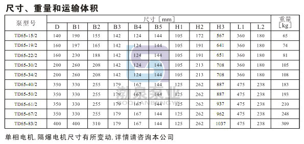 產(chǎn)品介紹 TD65-61/2立式熱水循環(huán)泵配有標準電機和機械密封。此類產(chǎn)品的結構與相近類型產(chǎn)品相比,更不易受到泵送液體中雜質的影響。 產(chǎn)品設計為頂部可拉出的拆裝形式,其可以在不影響管路系統(tǒng)的情況下對泵進行維護。 應用 產(chǎn)品適宜在清潔、稀薄、非侵蝕、非易爆易燃,且不含有任何可能對泵造成機械或化學損害的固體顆粒和纖維的液體中使用。具體對液體要求及應用如下;而在液體粘稠或密度較大情況下使用時會造成泵特性曲線的下降和能耗的增加。 液體溫度:-15℃~110℃ 系統(tǒng)最高壓力:常規(guī)型為PN12巴;特殊型為PN16巴。 TD65-61/2立式熱水循環(huán)泵產(chǎn)品在用于輸送水時,其可以用于生活用水、工業(yè)用水、冷卻系統(tǒng)用水和區(qū)域供熱系統(tǒng)的冷、熱用水。TD產(chǎn)品可以在以下位置使用: ·主循環(huán)泵 ·混合環(huán)路中的泵 ·鍋爐混流泵 ·燃氣冷凍機泵 ·部分流量過濾器泵 ·定壓系統(tǒng)用泵 ·生活熱水循環(huán) TD65-61/2立式熱水循環(huán)泵產(chǎn)品用于工業(yè)方面。如在化工、制藥、食品加工等行業(yè)。可以用于: ·原料的輸送 ·系統(tǒng)增壓 ·混合環(huán)路循環(huán)泵 ![]() ![]() 安裝條件 TD65-61/2立式熱水循環(huán)泵有不同的安裝要求,具體的安裝要求如下: ·系統(tǒng)管路具有支撐泵的能力,2.2kw以下(包括2.2kw)電機的泵可以直接懸置于管道中 ;系統(tǒng)管路不具有支撐泵的能力或泵電機功率大于2.2kw時,泵必須安裝在支架或底板上。 ·對于配套2.2kw以下(包括2.2kw)電機的泵可以安裝在水平或垂直于管道的位置上;對于2.2kw以上電機的泵只能安裝在垂直于管道的位置上。 ·泵的安裝,要保證泵在使用時系統(tǒng)管路的張力不應傳遞到泵體上。 ·為了保證電機的正常運轉,泵要安裝在保證有足夠冷卻的環(huán)境條件下,且冷卻空氣的溫度不能超過40℃。 ·如果泵安裝在戶外,必須配置合適的外罩以防止電器元件進水或凝霜。 ·為了方便對泵的檢查和維修,在泵的上、下方必須留有足夠的空間。泵電機小于5.5kw時最小留300mm;泵電機大于5.5kw(包括5.5kw)時最小留1000mm。 ·為了防止噪音和振動,保證獲得最佳運行效果,泵在安裝時要采用減振底座。一般采用水泥底座,底座的重量應該是大于或等于1.5×泵重量。 ·為滿足客戶的不同需要,產(chǎn)品分為帶底板和不帶底板兩種。 因產(chǎn)品生產(chǎn)批次、型號不同,產(chǎn)品圖片及安裝尺寸僅供參考,詳情可聯(lián)系我們的銷售人員了解更多TD65-61/2立式熱水循環(huán)泵相關信息!