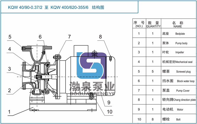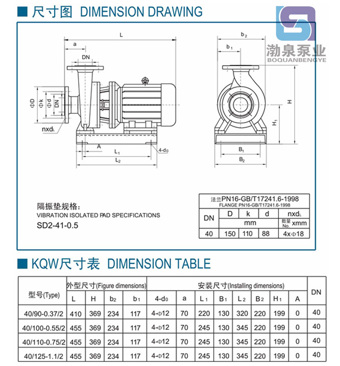 工作條件 轉(zhuǎn)速:2960r/min,980r/min或740r/min 流量范圍:1.6~3600m3/h 揚(yáng)程:≤127m 介質(zhì)溫度:-10℃~80℃、120℃ 環(huán)境溫度:最大+40℃ 最大工作壓力:1.6MPa(200及以下口徑)和1.0MPa(250及以下口徑) 汽蝕余量是實(shí)測值,實(shí)際使用時應(yīng)加0.5m的安全裕量。 可選配PN16-GB/T17241.6-1998配對法蘭。 材質(zhì) 泵殼、泵蓋、葉輪:鑄鐵 泵軸(不分段的):不銹鋼(2Cr13)或45#鍍鉻 機(jī)械密封動、靜環(huán):石墨、硬質(zhì)合金 (KQW40/90-0.37/2~KQW500/860-560/8) 填料密封:KQW500/630-200/8~KQW500/860-560/8 結(jié)構(gòu) 結(jié)構(gòu)緊湊的臥式單級泵,是最適用于現(xiàn)代建筑物的。 泵殼 泵腳支承型式的螺旋形泵殼,采用現(xiàn)代最優(yōu)水力模型設(shè)計制造,水平吸入,上方輸出,且口徑相同。法蘭符合GB/T17241.6-1998,并帶有Rp1/4或Rp3/8測壓口。 葉輪 閉式鑄鐵葉輪,優(yōu)秀的水力模型保證泵的效率和可靠性。 機(jī)械密封 用于水溫80℃、120℃以下免保養(yǎng),并不受轉(zhuǎn)向限制。特殊波紋管設(shè)計保證了動環(huán)的補(bǔ)償性和密封性可能。 型號說明 例如: KQW80/160-7.5/2 KQW 標(biāo)準(zhǔn)臥式單級泵 80/ 進(jìn)出口直徑 160- 葉輪名義直徑 7.5/2 電機(jī)功率/電機(jī)極數(shù) ![]() 因產(chǎn)品生產(chǎn)批次、型號不同,產(chǎn)品圖片及安裝尺寸僅供參考,詳情可聯(lián)系我們的銷售人員了解更多KQW40/90-0.37/2臥式單級離心泵相關(guān)信息!