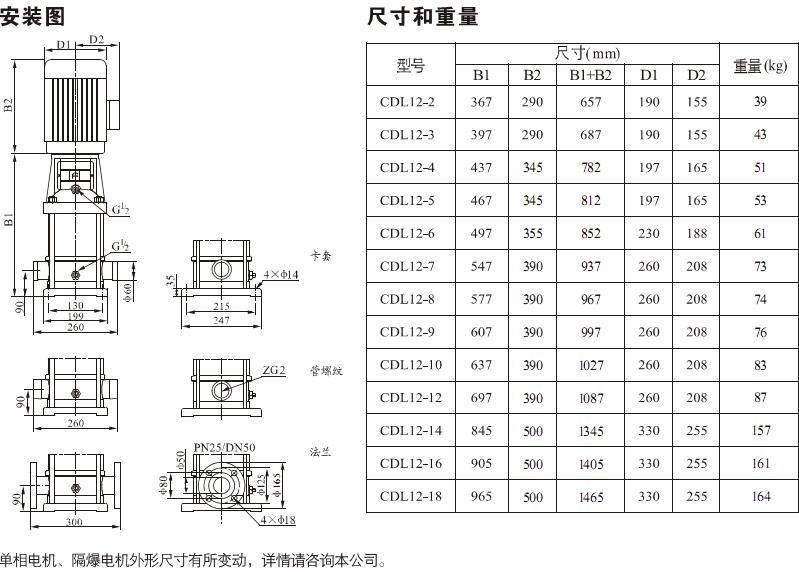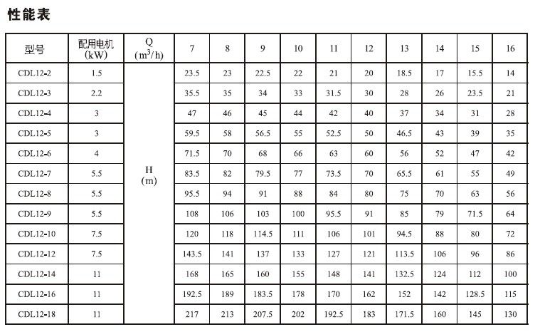 產(chǎn)品介紹 CDL/CDLF12-16FSWSC 不銹鋼多級(jí)離心泵是一種多功能產(chǎn)品,可以輸送從自來水到工業(yè)液體的各種不同介質(zhì),不銹鋼多級(jí)離心泵適應(yīng)于不同溫度、流量和壓力范圍,CDL適用于無腐蝕性液體,CDLF適用于輕度腐蝕性液體。 水:水廠過濾與輸送、水廠分區(qū)送水、主管增壓、高層建筑增壓。 工業(yè)增壓:流程水系統(tǒng)、清洗系統(tǒng)、高壓沖洗系統(tǒng)、消防系統(tǒng)。 工業(yè)液體輸送:冷卻和空調(diào)系統(tǒng)、鍋爐給水和冷凝系統(tǒng)、機(jī)床配套、酸和堿。 水處理:超濾系統(tǒng)、反滲透系統(tǒng)、蒸餾系統(tǒng)、分離器、游泳池。 灌溉:農(nóng)田灌溉、噴灌、滴灌。 運(yùn)行條件 稀薄、干凈、非易燃易爆并不含固體顆粒或纖維的液體。 液體溫度:常溫型 -15℃至+70℃ 熱水型 -15℃至+120℃ 環(huán)境溫度:最高+40℃ 海拔:最高1000m CDL/CDLF12-16FSWSC 不銹鋼多級(jí)離心泵為安裝標(biāo)準(zhǔn)電機(jī)的非自吸式多級(jí)離心泵,電機(jī)軸通過泵頭用軸聯(lián)器直接與泵軸連接,拉桿螺栓將耐壓筒、過流部件固定在泵頭和進(jìn)出水段之間,泵進(jìn)出水口在泵底同一直線上;本泵可根據(jù)需要配置智能保護(hù)器,對(duì)泵干轉(zhuǎn)、缺相、過載等進(jìn)行有效保護(hù)。 電機(jī) 電機(jī)為全封閉,風(fēng)冷式二極標(biāo)準(zhǔn)電機(jī)。 防護(hù)等級(jí):IP55 絕緣等級(jí):F 標(biāo)準(zhǔn)電壓, 50Hz ![]() ![]() ![]() 因產(chǎn)品生產(chǎn)批次、型號(hào)不同,產(chǎn)品圖片及安裝尺寸僅供參考,詳情可聯(lián)系我們的銷售人員了解更多CDL/CDLF12-16FSWSC 不銹鋼多級(jí)離心泵相關(guān)信息!