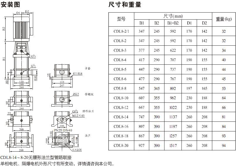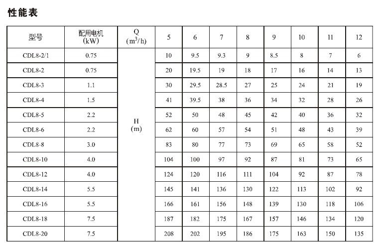 產(chǎn)品介紹 CDL/CDLF8-2FSWSC不銹鋼增壓泵是一種多功能產(chǎn)品,可以輸送從自來水到工業(yè)液體的各種不同介質(zhì),適應(yīng)于不同溫度、流量和壓力范圍,CDL適用于無腐蝕性液體,CDLF適用于輕度腐蝕性液體。 水:水廠過濾與輸送、水廠分區(qū)送水、主管增壓、高層建筑增壓。 工業(yè)增壓:流程水系統(tǒng)、清洗系統(tǒng)、高壓沖洗系統(tǒng)、消防系統(tǒng)。 工業(yè)液體輸送:冷卻和空調(diào)系統(tǒng)、鍋爐給水和冷凝系統(tǒng)、機床配套、酸和堿。 水處理:超濾系統(tǒng)、反滲透系統(tǒng)、蒸餾系統(tǒng)、分離器、游泳池。 灌溉:農(nóng)田灌溉、噴灌、滴灌。 運行條件 稀薄、干凈、非易燃易爆并不含固體顆?;蚶w維的液體。 液體溫度:常溫型 -15℃至+70℃ 熱水型 -15℃至+120℃ 環(huán)境溫度:最高+40℃ 海拔:最高1000m CDLF8-8FSWSC不銹鋼鍋爐給水增壓泵為安裝標(biāo)準(zhǔn)電機的非自吸式多級離心泵,電機軸通過泵頭用軸聯(lián)器直接與泵軸連接,拉桿螺栓將耐壓筒、過流部件固定在泵頭和進出水段之間,泵進出水口在泵底同一直線上;本泵可根據(jù)需要配置智能保護器,對泵干轉(zhuǎn)、缺相、過載等進行有效保護。 電機 電機為全封閉,風(fēng)冷式二極標(biāo)準(zhǔn)電機。 防護等級:IP55 絕緣等級:F 標(biāo)準(zhǔn)電壓, 50Hz ![]() ![]() ![]() 因產(chǎn)品生產(chǎn)批次、型號不同,產(chǎn)品圖片及安裝尺寸僅供參考,詳情可聯(lián)系我們的銷售人員了解更多CDLF8-2FSWSC不銹鋼增壓泵相關(guān)信息!