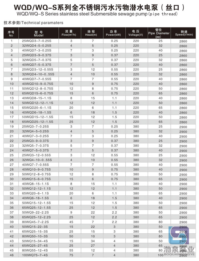 產(chǎn)品介紹 產(chǎn)品概述: 1、32WQ4-5-0.25S 不銹鋼污水污物潛水電泵采用獨(dú)特的單、雙流道式葉輪結(jié)構(gòu),大大提高了污物的通過(guò)能力,根據(jù)產(chǎn)品型號(hào)能通 過(guò) 泵口徑 5倍的纖維與直徑約為泵出口口徑50%的固體顆粒。 2、采用氟橡膠雙端面機(jī)封,氟橡膠徑向O型圈密封,有效地對(duì)環(huán)境惡劣的液體進(jìn)行密封保護(hù)作用。 3、采用精密鑄造泵殼,重量輕、耐腐蝕、節(jié)能型、外形美觀、檢修方便,無(wú)需建泵房,潛入水中即可工作,減少工程造價(jià)。 4、排污泵內(nèi)安裝過(guò)熱與電流保護(hù)器,防止電機(jī)過(guò)載發(fā)熱。 5、可根據(jù)客戶特殊要求定制防腐蝕電纜線、四氟機(jī)封,及高溫液體的零件配置。 使用條件: 1、以葉輪中心為準(zhǔn),潛入水下深度不得超過(guò)5m。 2、輸送介質(zhì)溫度不高于60℃。 3、輸送介質(zhì)的PH值304(4-10),316(2-13). 產(chǎn)品用途: 不銹鋼排污泵適用于建筑樓宇、醫(yī)院、住宅小區(qū)、市政工程、道路交通及施工、工廠排污、養(yǎng)殖、藥業(yè)、飲料、海水鹽水、一般腐蝕性介質(zhì)中含有的固體顆粒、長(zhǎng)纖維廢水、污水。 產(chǎn)品優(yōu)勢(shì): 32WQ4-5-0.25S 不銹鋼污水污物潛水電泵采用獨(dú)特的單雙流道式葉輪結(jié)構(gòu),氟橡膠雙端面機(jī)封、氟橡膠O型圈密封,不銹鋼焊接轉(zhuǎn)子軸,以及不銹鋼精密鑄造外殼。其中,國(guó)標(biāo)法蘭系列采用雙端面、單端面雙套機(jī)封密封。該產(chǎn)品能有效地在惡劣的液體環(huán)境下工作,具有耐腐蝕、耐高溫等特點(diǎn)。特別適用于化糞池、化工液體、海水排澇等場(chǎng)合。 ![]() 因產(chǎn)品生產(chǎn)批次、型號(hào)不同,產(chǎn)品圖片及安裝尺寸僅供參考,詳情可聯(lián)系我們的銷售人員了解更多32WQ4-5-0.25S 不銹鋼污水污物潛水電泵相關(guān)信息!
