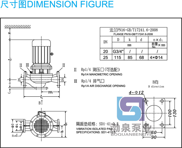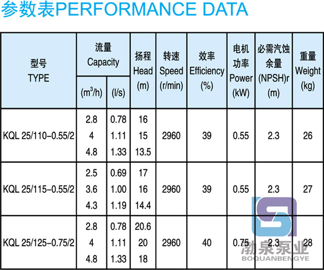產品介紹 KQL25/115-0.55/2 立式空調循環(huán)管道泵供輸送不含固體顆粒的清水及物理化學性質類似于水的液體之用。同時根據(jù)使用溫度、介質等不同在ISG型管道離心泵基礎上派出適用熱水、高溫、腐蝕性化工泵、油泵。該產品具有同效節(jié)能、噪音低、性能穩(wěn)定等特點。 用途: KQL25/115-0.55/2 立式空調循環(huán)管道泵用于空調、采暖、衛(wèi)生用水、水處理冷卻冷凍系統(tǒng)、液體循環(huán)和供水、增壓及灌溉等領域中無腐蝕的冷水和熱水輸送。 工作條件: 轉速:2960r/min,1480r/min或980r/min 流量范圍:1.8~2000m3/h 揚程:≤127m 介質溫度:-10℃~120℃ 環(huán)境溫度:最大+40℃;海拔高度小于1000m;相對濕度不超過95% 材質: 泵殼、泵蓋、葉輪:鑄鐵 泵軸:45#鋼鍍鉻或不銹鋼(2Cr13) 機械密封動、靜環(huán):浸銻石墨、碳化硅 結構:結構緊湊的單級泵,適用于現(xiàn)代建筑物。 產品特點: KQL25/115-0.55/2 立式空調循環(huán)管道泵結構緊湊、合理,泵與電機直接連接,外形美觀,占地面積小效率高,閉式鑄鐵葉輪,軸承配置合理,葉輪懸臂短,機泵軸完全同心,泵運行平穩(wěn)、可靠,噪音低壽命長,強制環(huán)流沖洗機械密封,免保養(yǎng)、無滲漏。 管道泵選型指南: 例如:KQL80/160-7.5/2 或KQW80/160-7.5 KQL標準立式單級離心泵,KQW標準臥式單級離心泵 80進出口直徑 160葉輪名義直徑 7.5/2電機功率/電機極數(shù) ![]() ![]() ![]() 因產品生產批次、型號不同,產品圖片及安裝尺寸僅供參考,詳情可聯(lián)系我們的銷售人員了解更多KQL25/115-0.55/2 立式空調循環(huán)管道泵相關信息!