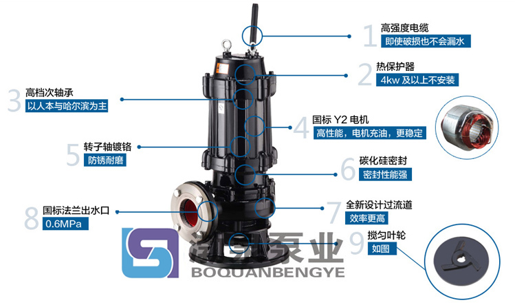 產(chǎn)品介紹 150WQ100-40-22 高揚(yáng)程無(wú)堵塞潛污泵是在引進(jìn)國(guó)外現(xiàn)先進(jìn)技術(shù)的基礎(chǔ)上,結(jié)合國(guó)內(nèi)水泵的使用特點(diǎn)而研制成功的新一代泵類產(chǎn)品,具有節(jié)能效果顯著、防纏繞、無(wú)堵塞、自動(dòng)安裝和自動(dòng)控制等特點(diǎn)。在排送固體顆粒和長(zhǎng)纖維垃圾方便,具有獨(dú)特效果。該系列排污泵采用獨(dú)特葉輪結(jié)構(gòu)和新型機(jī)械密封,能有效地輸送含有固體物和長(zhǎng)纖維。葉輪與傳統(tǒng)葉輪相比,該泵葉輪采用單流道或雙流道形式,它類似于一截面大小相同的彎管,具有非常好的過流性,配以合理的蝸室,使得該泵具有效果高、葉輪經(jīng)動(dòng)靜平衡試驗(yàn),使泵在運(yùn)行中無(wú)振動(dòng)。 該泵水力性能先進(jìn)、成熟,產(chǎn)品經(jīng)測(cè)試各項(xiàng)性能指標(biāo)均達(dá)到有關(guān)標(biāo)準(zhǔn)規(guī)定,產(chǎn)品投放市場(chǎng)后以其獨(dú)特的功效,可靠的性能,穩(wěn)定的質(zhì)量受到廣大用戶的歡迎和好評(píng)。 150WQ100-40-22 高揚(yáng)程無(wú)堵塞潛污泵應(yīng)用范圍 1.市政工程、建筑工地; 2.住宅區(qū)的污水排放; 3.醫(yī)院、賓館等的污水排放; 4.城市污水處理廠排水系統(tǒng); 5.人防系統(tǒng)排水站,自來(lái)水廠的給水裝置; 6.工廠、商業(yè)嚴(yán)重污染污水的排放。 150WQ100-40-22 高揚(yáng)程無(wú)堵塞潛污泵產(chǎn)品特點(diǎn) 1.采用大流道抗堵塞水力部件設(shè)計(jì),大大提高污物通過能力,能有效地通過水泵口徑的5倍纖維物質(zhì)和直徑為泵口徑約30%的固體顆粒。 2.設(shè)計(jì)合理,配套電機(jī)合理,效率高,節(jié)能效果顯著。 3.機(jī)械密封采用雙道串聯(lián)密封,材質(zhì)為硬質(zhì)耐腐碳化鎢,具有耐用、耐磨等特點(diǎn),可以使泵安全連續(xù)運(yùn)行8000小時(shí)以上。 4.泵結(jié)構(gòu)緊湊,體積小,移動(dòng)方便,安裝簡(jiǎn)便,無(wú)需建泵房,潛入水中即可工作,大大減少工程造價(jià)。 5.泵油室內(nèi)設(shè)有油水探頭,當(dāng)水泵側(cè)機(jī)械密封損壞后,水進(jìn)入油室,探頭發(fā)生信號(hào),對(duì)泵實(shí)施保護(hù)。 6.可根據(jù)用戶需要配合全自動(dòng)安全保護(hù)控制柜,對(duì)泵的漏水、漏電、過載及超溫等進(jìn)行監(jiān)控,保證泵運(yùn)行可靠安全。 7.雙導(dǎo)軌自動(dòng)耦合安裝系統(tǒng),給泵的安裝、維修帶來(lái)了極大的方便,人可不必為此而進(jìn)出污水坑。 8.浮球開關(guān)可根據(jù)所需的水位變化,自動(dòng)控制泵的停啟,無(wú)需專人看管。 9.在使用揚(yáng)程范圍內(nèi)保證電機(jī)運(yùn)行不過載。 10.根據(jù)使用場(chǎng)合電機(jī)可采用水套式外循環(huán)冷卻系統(tǒng),能保證水泵在無(wú)水(干式)狀態(tài)下安全運(yùn)行。 11.安裝方式有固定式自動(dòng)耦合安裝和移動(dòng)式自由安裝二種,可滿足不同的使用場(chǎng)合。 型號(hào)意義 50WQ25-32-5.5 50-泵排出口公稱直徑(mm) QW-潛水排污泵 25-額定流量(m3/h) 32-額定揚(yáng)程(m) 5.5-配用電機(jī)額定功率(kW) ![]() 主要性能參數(shù)