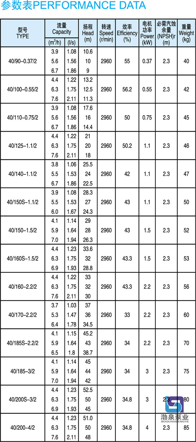 產(chǎn)品介紹 KQL40/110-0.75/2 立式單級單吸離心泵供輸送不含固體顆粒的清水及物理化學性質類似于水的液體之用。同時根據(jù)使用溫度、介質等不同在ISG型管道離心泵基礎上派出適用熱水、高溫、腐蝕性化工泵、油泵。該產(chǎn)品具有同效節(jié)能、噪音低、性能穩(wěn)定等特點。 用途: KQL40/110-0.75/2 立式單級單吸離心泵用于空調(diào)、采暖、衛(wèi)生用水、水處理冷卻冷凍系統(tǒng)、液體循環(huán)和供水、增壓及灌溉等領域中無腐蝕的冷水和熱水輸送。 工作條件: 轉速:2960r/min,1480r/min或980r/min 流量范圍:1.8~2000m3/h 揚程:≤127m 介質溫度:-10℃~120℃ 環(huán)境溫度:最大+40℃;海拔高度小于1000m;相對濕度不超過95% 材質: 泵殼、泵蓋、葉輪:鑄鐵 泵軸:45#鋼鍍鉻或不銹鋼(2Cr13) 機械密封動、靜環(huán):浸銻石墨、碳化硅 結構:結構緊湊的單級泵,適用于現(xiàn)代建筑物。 產(chǎn)品特點: KQL40/110-0.75/2 立式單級單吸離心泵結構緊湊、合理,泵與電機直接連接,外形美觀,占地面積小效率高,閉式鑄鐵葉輪,葉輪懸臂短,機泵軸完全同心,泵運行平穩(wěn)、可靠,噪音低壽命長,強制環(huán)流沖洗機械密封,免保養(yǎng)、無滲漏。 管道泵選型指南: 例如:KQL80/160-7.5/2 或KQW80/160-7.5 KQL標準立式單級離心泵,KQW標準臥式單級離心泵 80進出口直徑 160葉輪名義直徑 7.5/2電機功率/電機極數(shù) ![]() ![]() 因產(chǎn)品生產(chǎn)批次、型號不同,產(chǎn)品圖片及安裝尺寸僅供參考,詳情可聯(lián)系我們的銷售人員了解更多KQL40/110-0.75/2 立式單級單吸離心泵相關信息!