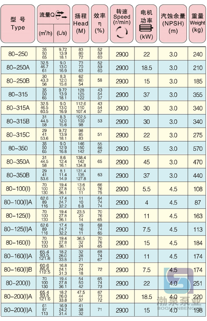 產(chǎn)品介紹 ISW80-250B 臥式管道離心泵是采用IS型離心泵之性能參數(shù),在一般臥式泵的基礎(chǔ)上進(jìn)行巧妙組合設(shè)計而成,同時根據(jù)使用溫度、介質(zhì)等不同在ISW型管道泵基礎(chǔ)上派生出適用熱水泵、高溫、耐腐蝕化工泵、油泵。該系列產(chǎn)品具有高效節(jié)能、噪音低、性能可靠等優(yōu)點(diǎn),符合JB/T53058-93的標(biāo)準(zhǔn)要求,產(chǎn)品按ISO2858標(biāo)準(zhǔn)設(shè)計制造。具有效率高、流量及揚(yáng)程范圍大、結(jié)構(gòu)合理、成本低、壽命長、占地面積小、安裝維修方便等特點(diǎn)。是替代IS、DL等常規(guī)產(chǎn)品的新離心泵,特別適用于高層建筑的給排水、噴灌、冶金、市政、礦山水處理排污,食品、化工、空調(diào)及其他行業(yè)輸送水、化學(xué)介質(zhì)及其他液體。 ISW80-250B 臥式管道離心泵流量范圍15~1200m3 /h,分基本型、擴(kuò)流型、A、B、C切割型等250多種規(guī)格,并根據(jù)流體介質(zhì)和溫度不同又派生出清水泵、熱水泵、化工泵、防爆油泵、防爆化工泵等系列產(chǎn)品。 ISW80-250B 臥式管道離心泵主要用途 1、ISW臥式清水泵供輸送清水及物理化學(xué)性質(zhì)類似于清水的其它液體之用,適用于工業(yè)和城市給排水、高層建筑增壓送水、園林噴灌、消防增壓、遠(yuǎn)距離輸送、暖通制冷循環(huán)、浴室等冷暖水循環(huán)增壓及設(shè)備配套,使用溫度T≤80℃。 2、ISWR臥式熱水泵,廣泛適用于:冶金、化工、紡織、造紙以及賓館飯店等鍋爐熱水增壓循環(huán)輸送及城市采暖系統(tǒng),ISWR型使用溫度T≤120℃。 3、ISWH臥式化工泵,供輸送不含固體顆粒,具有腐蝕性。粘度類似于水的液體,適用于石油、化工、冶金、電力、造紙、食品、制藥和合成纖維等部門,使用溫度為-20℃~+120℃。 4、ISWY臥式管道油泵,供輸送汽油、煤油、柴油等油類產(chǎn)品或易燃、易爆液體,被輸送介質(zhì)溫度為-20℃~120℃。 5、ISWHY型臥式不銹鋼防爆化工離心泵,適用于輸送易燃性化工液體。 6、ISWD臥式低轉(zhuǎn)速泵,適應(yīng)要求環(huán)境噪聲很低的場合,使用溫度T≤120℃。 ISW80-250B 臥式管道離心泵工作條件 1.吸入壓力≤1.0MPa,或泵系統(tǒng)最高工作壓力≤1.6MPa,即吸入口壓力+泵揚(yáng)程≤1.6MPa、泵靜壓試驗壓力為≤2.5MPa,訂貨時請注明系統(tǒng)工作壓力。泵系統(tǒng)工作壓力大于1.6MPa時應(yīng)在訂貨時另行提出,以便在制造時泵的過流部分和聯(lián)接部分采用鑄鋼材料。 2.環(huán)境溫度<40℃,相對濕度<40%。 3.所輸送介質(zhì)中固體顆粒體積含量不超過單位體積的0.1,粒度<0.2mm。 注:如果用介質(zhì)為帶有細(xì)小顆粒,請在訂貨時說明,以便廠家采用耐磨式機(jī)械密封。 ISW80-250B 臥式管道離心泵產(chǎn)品特點(diǎn) 運(yùn)行平穩(wěn):泵軸的絕對同心度及葉輪優(yōu)異的動靜平衡,保證平穩(wěn)運(yùn)行,絕無振動。 滴水不漏:不同材質(zhì)的硬質(zhì)合金密封,保證了不同介質(zhì)輸送均無泄漏。 噪音低:兩個低噪音軸承支撐下的水泵,運(yùn)轉(zhuǎn)平穩(wěn),除電機(jī)微弱聲響,基本無噪音。 故障率低:結(jié)構(gòu)簡單合理,關(guān)鍵部分采用品質(zhì)配套,整機(jī)無故障工作時間大大提高。 維修方便:更換密封、軸承,簡易方便。 占地更?。撼隹诳上蜃?、向右、向上三個方向,便于管道布置安裝,節(jié)省空間。 ![]() ![]() ![]() 因產(chǎn)品生產(chǎn)批次、型號不同,產(chǎn)品圖片及安裝尺寸僅供參考,詳情可聯(lián)系我們的銷售人員了解更多ISW80-250B 臥式管道離心泵相關(guān)信息!