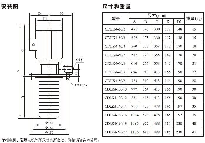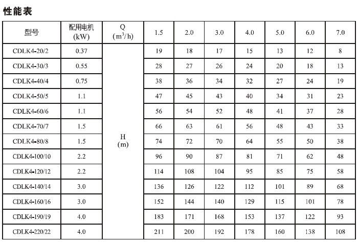 產(chǎn)品介紹 一、概述 CDLKF4-120/12浸入式多級離心泵為安裝標準電機 為滿足水槽或容器的安裝深度,可安裝空腔體來改變泵本身的長度,不同的級數(shù)長度見尺寸和重量表和可供產(chǎn)品范圍表。 二、應(yīng)用范圍 CDLKF4-120/12液下式多級離心泵用于輸送機床冷卻液、潤滑液、冷凝水輸送、工業(yè)清洗設(shè)備和其它適合浸入式泵使用的場合,適合于不同溫度、流量和壓力范圍,CDLK適用于無腐蝕性液體,CDLKF適于輕度腐蝕性液體。 具體用于電火花、車床、磨床、加工中心、冷卻裝置、工業(yè)清洗設(shè)備、過濾系統(tǒng)等。 三、電機 電機為全封閉,風冷式二極標準電機。 防護等級:IP55 絕緣等級:F 標準電壓:50HZ:1*220-230/240V 3*200/346V 3*220-240/380-415V 3*220-225/380-440V 其他電壓的電機按要求可供。 單相電壓從0.37-2.2kw可供。 四、運行條件 CDLKF4-120/12浸入式多級離心泵適用于稀薄、干凈、不含固體顆粒和纖維的非易爆液體,可輸送水及冷卻用水溶液和切割潤滑液。 液體溫度:常溫型-15℃~+70℃ 熱水型+70℃~+120℃ ![]() ![]() 因產(chǎn)品生產(chǎn)批次、型號不同,產(chǎn)品圖片及安裝尺寸僅供參考,詳情可聯(lián)系我們的銷售人員了解更多CDLKF4-120/12浸入式多級離心泵相關(guān)信息!