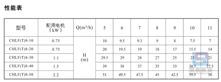 產(chǎn)品介紹 CHLF8-10LSWSC輕型臥式多級離心泵配加長軸電機(jī)采用了免修機(jī)械密封,緊湊式結(jié)構(gòu)使泵尺寸很小,軸向入口和徑向出口。輕型段式多級離心泵的過流部件均采用不銹鋼材料(304或316)制成,輕型不銹鋼多級離心泵具有低噪音,耐輕腐蝕,外形美觀、體積小、重量輕、使用壽命長等特點(diǎn),不同材質(zhì)的硬質(zhì)合金密封,保證了不同介質(zhì)輸送均無泄漏;噪音低:兩個低噪音軸承下的水泵,運(yùn)轉(zhuǎn)平穩(wěn),除電機(jī)微弱聲響,基本無噪聲;故障率低:結(jié)構(gòu)簡單合理,整機(jī)無故障工作時間大大提高。采用國內(nèi)優(yōu)秀水力模型優(yōu)化設(shè)計而成,是理想的新一代高效節(jié)能輕型臥式多級離心泵。采用了免修機(jī)械密封。輕型段式多級離心泵的過流部件均采用不銹鋼材料(304或316)制成,具有低噪音,耐輕腐蝕,外形美觀、體積小、重量輕、使用壽命長等特點(diǎn)。 二、應(yīng)用范圍: 主要用于家庭型中央空調(diào)循環(huán)及工業(yè)上液體的傳輸。如脫礦物質(zhì)水、軟水、凈化系統(tǒng)、輕油等的循環(huán)和增壓。 1)小型中央空調(diào)循環(huán) 2)冷卻系統(tǒng) 3)工業(yè)清洗 4)水處理(水的凈化) 5)水產(chǎn)養(yǎng)殖 6)施肥/計量系統(tǒng) 7)環(huán)境應(yīng)用 三、工作條件: 稀薄、干凈、不凝、不爆炸、不含固體顆?;蚶w維的液體。 液體溫度: 常溫型-15℃至+70℃ 熱水型+70℃至+110℃ 最大環(huán)境溫度:+40℃ 最大運(yùn)作壓力:10巴 最大進(jìn)口壓力受最大運(yùn)作壓力限制 介質(zhì)酸堿性:PH4~9 四、輸送液體: 1、稀薄、清潔、不含固體顆?;蚶w維的非易燃易爆液體。 2、泵可以輸送諸如礦泉水、軟化水、純水、清油和其它輕化工介質(zhì)。 3、當(dāng)輸送液體的密度或粘度大于水,如需要,必須配用大功率電機(jī)。 4、泵是否適用于某一特定液體由多種因素決定,其中最重要的是氯含量、PH值、溫度和溶濟(jì)、油的含量等。 五、曲線條件: 下述條件適用于后面所示性能曲線。 1、所有曲線都基于電機(jī)在恒速2900rpm的測量值。 2、曲線容差符合ISO9906,附錄A。 3、測試采用20℃不含空氣的水,運(yùn)動粘度為1mm2/s。 4、泵的使用參照加粗曲線的性能范圍,以防流量過小產(chǎn)生過熱和流量過大使電機(jī)過載等。 六、電機(jī): CHLF8-40LSWSC輕油增壓泵電機(jī)為全封閉,風(fēng)冷式二極電機(jī) 防護(hù)等級:IP55 絕緣等級:F 標(biāo)準(zhǔn)電壓, 50Hz: 1×220-240V 3×220-240V 380-415V ![]() 因產(chǎn)品生產(chǎn)批次、型號不同,產(chǎn)品圖片及安裝尺寸僅供參考,詳情可聯(lián)系我們的銷售人員了解更多CHLF8-10LSWSC輕型臥式多級離心泵相關(guān)信息!