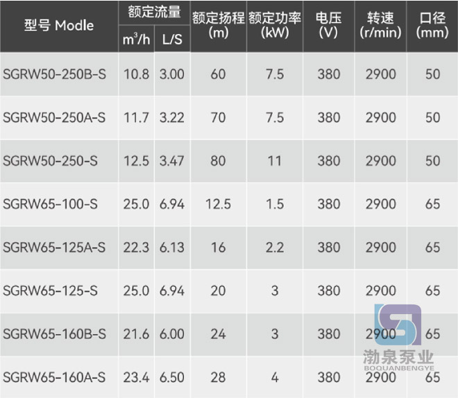 產(chǎn)品介紹 主要用途 SGRW65-100-S不銹鋼臥式管道離心泵可供輸送清水及物理化學(xué)性質(zhì)類似于清水的其他液體之用,適用于工業(yè)和城市給排水、高層建筑增壓送水、園林噴灌、消防增壓、遠距離輸送、暖通制冷等冷熱水循環(huán)增壓及設(shè)備配套、能源、治金、化工、紡織、造紙以及賓館、飯店等鍋爐熱水增壓輸送及城市采暖系統(tǒng)循環(huán)用泵,使用介質(zhì)溫度T≤103℃。 產(chǎn)品特點 1、泵結(jié)構(gòu)緊湊、體積小、外形美觀。 2、進出口徑相同,安裝方便,無需改變管路,可像閥門一樣直接安裝在管路任何部位。 3、機泵同軸,簡化了中間結(jié)構(gòu),增加了運行的平穩(wěn)性,葉輪具有很好的動靜平衡,運行時震動小、噪音低,延長了軸承的使用壽命,改善了使用環(huán)境。 4、電機采用高效散熱鑄鋁機殼、進口軸承、不銹鋼316焊接轉(zhuǎn)子軸、氟橡膠“O”形圈、氟橡膠機械密封,過流部件全部采用不銹鋼精密鑄造。 5、維修方便、無須拆卸管道,只要拆下連接架,取出電機及傳動組件即可進行檢修維護。 6、其結(jié)構(gòu),精心設(shè)計,不僅縮小了泵房面積,改善了空間,而且大大節(jié)省基建投資。 7、可定制防爆電機,可定制四氟機封。 使用條件 1、適用介質(zhì):固體不溶物體積含量不超過單位體積的0.1%,粒度不大于0.2mm。(介質(zhì)如帶有細小顆粒須采用耐磨式機械密封,請在訂貨時說明。) 2、周圍環(huán)境溫度不超過40℃,相對濕度不超過95%,海拔高度不超過1000m; 3、輸送介質(zhì)的PH值304(4-10)、316(2-13); 4、輸送介質(zhì)的密度≤1.05×103kg/m3; 5、使用電壓220V/380V,頻率50Hz,電壓波動不超過額定值的±10%。 型號說明 ![]() ![]() 因產(chǎn)品生產(chǎn)批次、型號不同,產(chǎn)品圖片及安裝尺寸僅供參考,詳情可聯(lián)系我們的銷售人員了解更多SGRW65-100-S不銹鋼臥式管道離心泵相關(guān)信息!