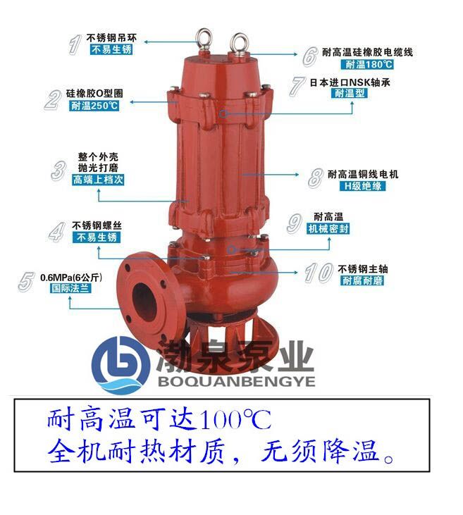 150WQR130-15-11,耐高溫潛水排污泵是一種耐溫達(dá)高100℃材質(zhì)為鑄鐵的一款耐高溫排污泵,此款產(chǎn)品具有抽送介質(zhì)溫度高、安裝移動(dòng)方便、高效節(jié)能、防纏繞、無(wú)堵塞等特點(diǎn)??捎糜谳斔秃畚铩⒐腆w顆粒、纖維的高溫液體介質(zhì)。眾所周知目前市面上的排污泵只能輸送介質(zhì)溫度為常溫或40℃以內(nèi)的介質(zhì),這款WQR耐高溫排污泵就很好解決了一些用戶介質(zhì)溫度在40-100℃度之間不能使用潛水排污泵只能改過(guò)其它類(lèi)型水泵的問(wèn)題。 150WQR130-15-11,耐高溫潛水排污泵產(chǎn)品配置: 1、 采用耐高溫電機(jī)(H級(jí)絕緣);高溫銅線、H級(jí)絕緣材料和耐高溫絕緣漆。 2、采用耐高溫電纜、密封圈、機(jī)械密封和NSK日本進(jìn)口高溫軸承。耐溫可達(dá)100度! 3、帶攪勻裝置, 有攪拌功能, 這個(gè)攪勻裝置在進(jìn)出口下面, 隨著電機(jī)轉(zhuǎn)動(dòng), 攪勻裝置也跟著轉(zhuǎn)動(dòng),起到攪拌左右,能把水底的淤泥攪勻,再隨水一起排出。