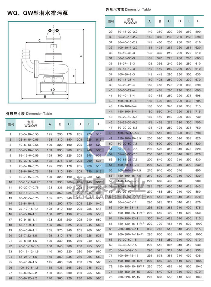 耐高溫排污泵WQR系列型號(hào)50WQR10-10-0.75 流量:10立方/小時(shí) 揚(yáng)程:10米 功率:0.75千瓦 材質(zhì):鑄鐵(可生產(chǎn)不銹鋼材質(zhì)) 耐溫100度。具有抽送介質(zhì)溫度高、安裝移動(dòng)方便、高效節(jié)能、防纏繞、無堵塞等特點(diǎn)??捎糜谳斔秃畚铩⒐腆w顆粒、纖維的高溫液體介質(zhì)。 主要用途: 1、市政工程、建筑工地。 2、城市污水處理排放系統(tǒng)。 3、企業(yè)、單位廢水排放。 4、住宅區(qū)的污水排放,. 5、地鐵、地下室、人防工程, 6、醫(yī)院、賓館、高層建筑污水排放。 7、自來水廠、水利工程等。 8、養(yǎng)殖場(chǎng)、化糞池。 9、電廠、鋼鐵廠抽送熱水。