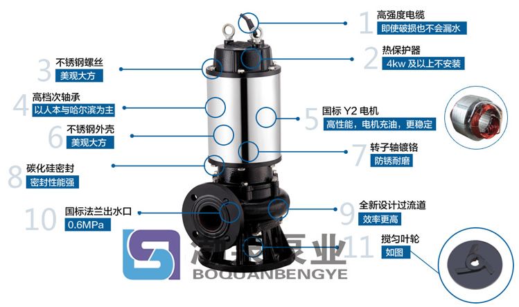 自動攪勻排污泵是在普通排污泵的基礎上采用自動攪拌裝置,該裝置隨電機軸旋轉,產(chǎn)生極強的攪拌力,將污水池內(nèi)的沉積物攪拌成懸浮物,吸入泵內(nèi)排出,是具有明顯的先進性和用性的環(huán)保產(chǎn)品。 YWQ、JPWO系列自動攪勻排污泵是在普通排污泵的基礎上采用自動攪拌裝置,該裝置隨電機軸旋轉,產(chǎn)生極強的攪拌力,將污水池內(nèi)的沉積物攪拌成懸浮物,吸入泵內(nèi)排出,提高了泵的防堵、排污能力,一次性完成了排水、清污、除淤、節(jié)約了運行成本,是具有明顯的先進性和用性的環(huán)保產(chǎn)品。